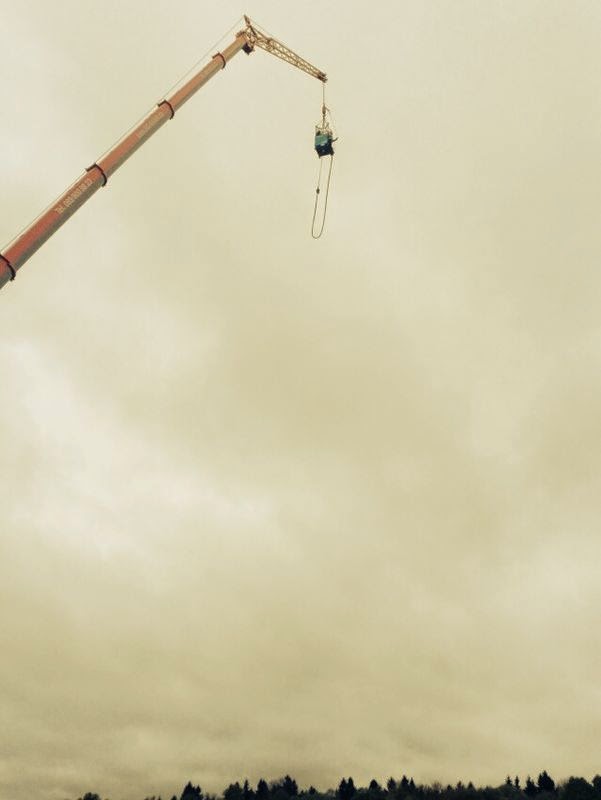 Still smiling on my way up! Funny moment - the wind blew during the ascent and I was shifting a bit so one of the two guys in the cherry picker had to hold onto my harness so that I didn't prematurely fall out.